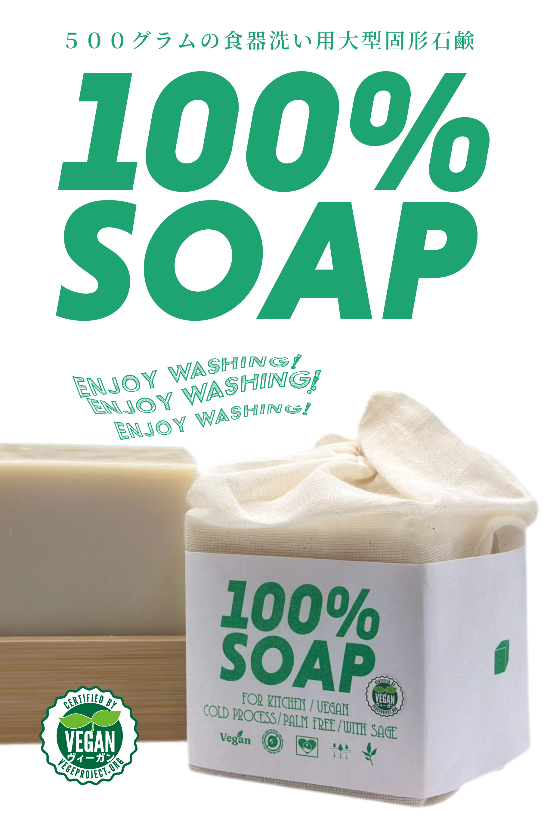 100% SOAPはひとつ500グラム、大型の固形石鹸で約2~3ヶ月使うことができます。詰め替えで発生するプラスチックごみも一切なく、完全プラフリーを実現。ヴィーガン処方、保存料、香料、パームオイル不使用で、家族や環境に優しい商品です。