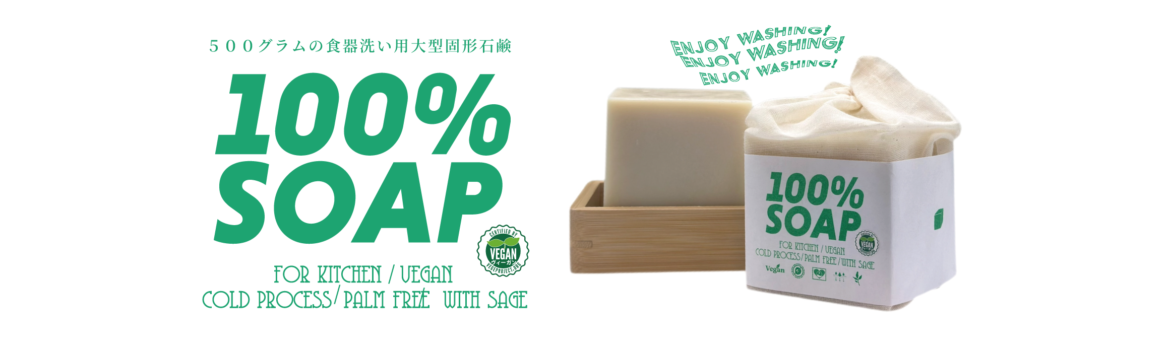 100%SOAPはNPO法人ベジプロジェクトジャパンによるヴィーガン製品の認定取得済みの製品です。